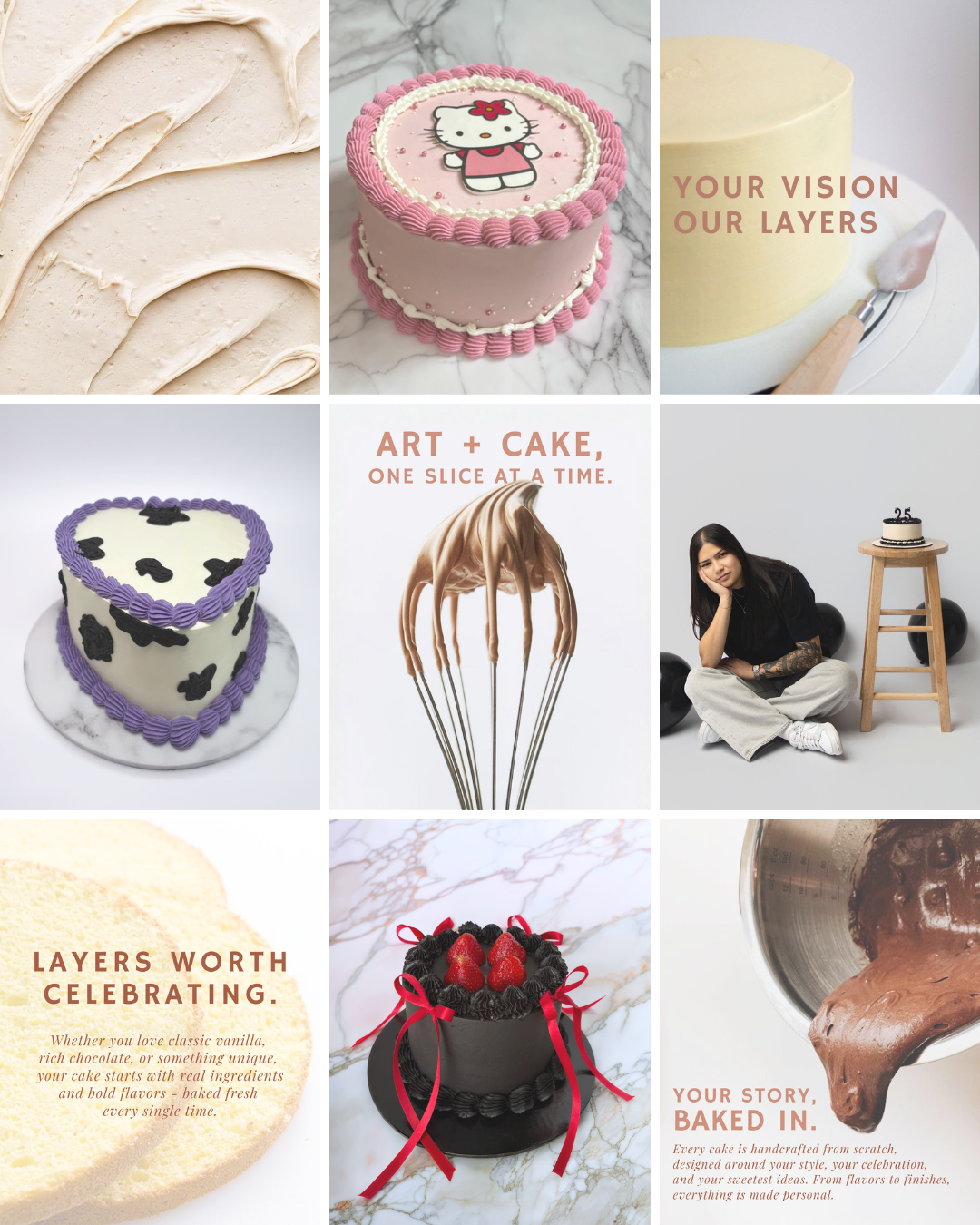 Baked In Layers is a boutique personalized cake studio. I developed and designed the brand’s initial social media presence, creating graphic overlays, layout compositions, and messaging to elevate their digital look. Working with a combination of client-provided photography and curated imagery, I structured a cohesive feed that balances product shots, typography-driven posts, and visual storytelling.